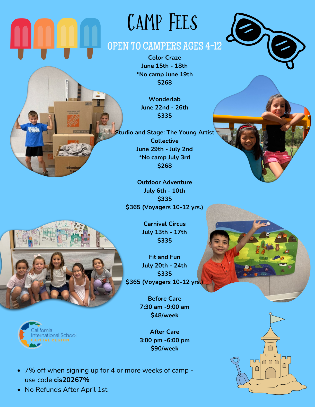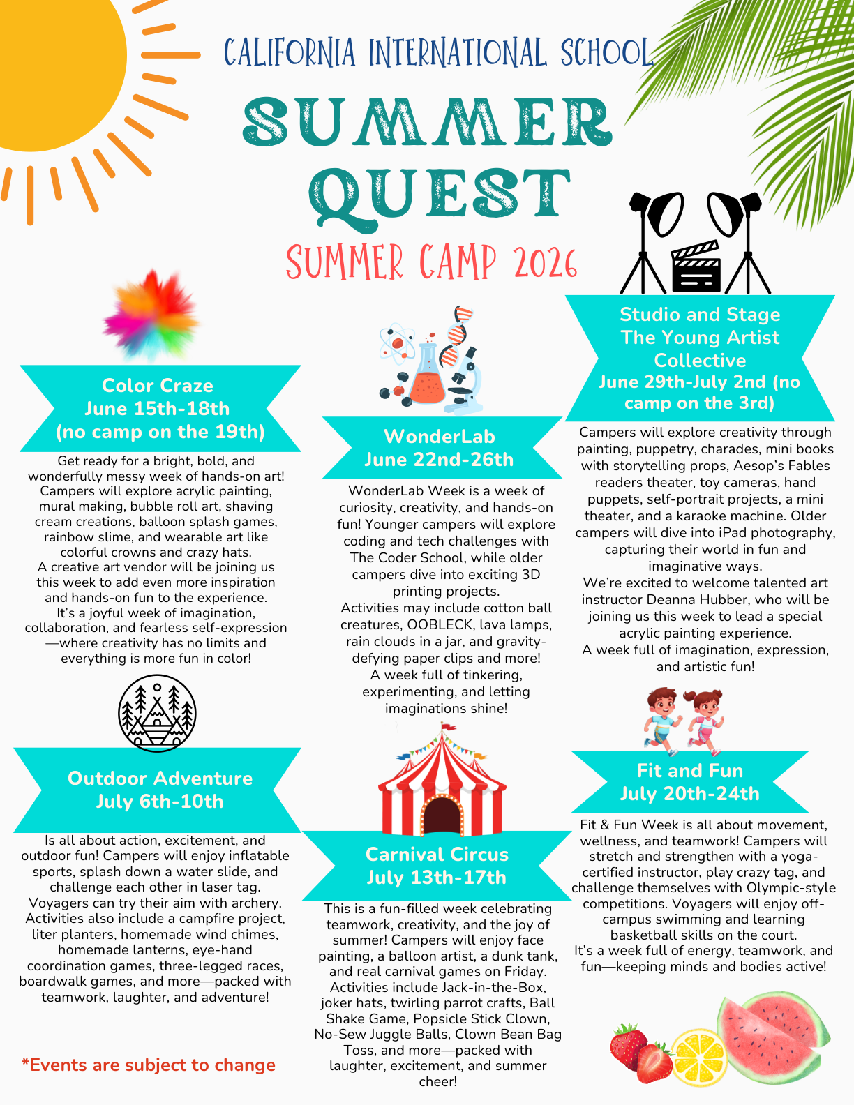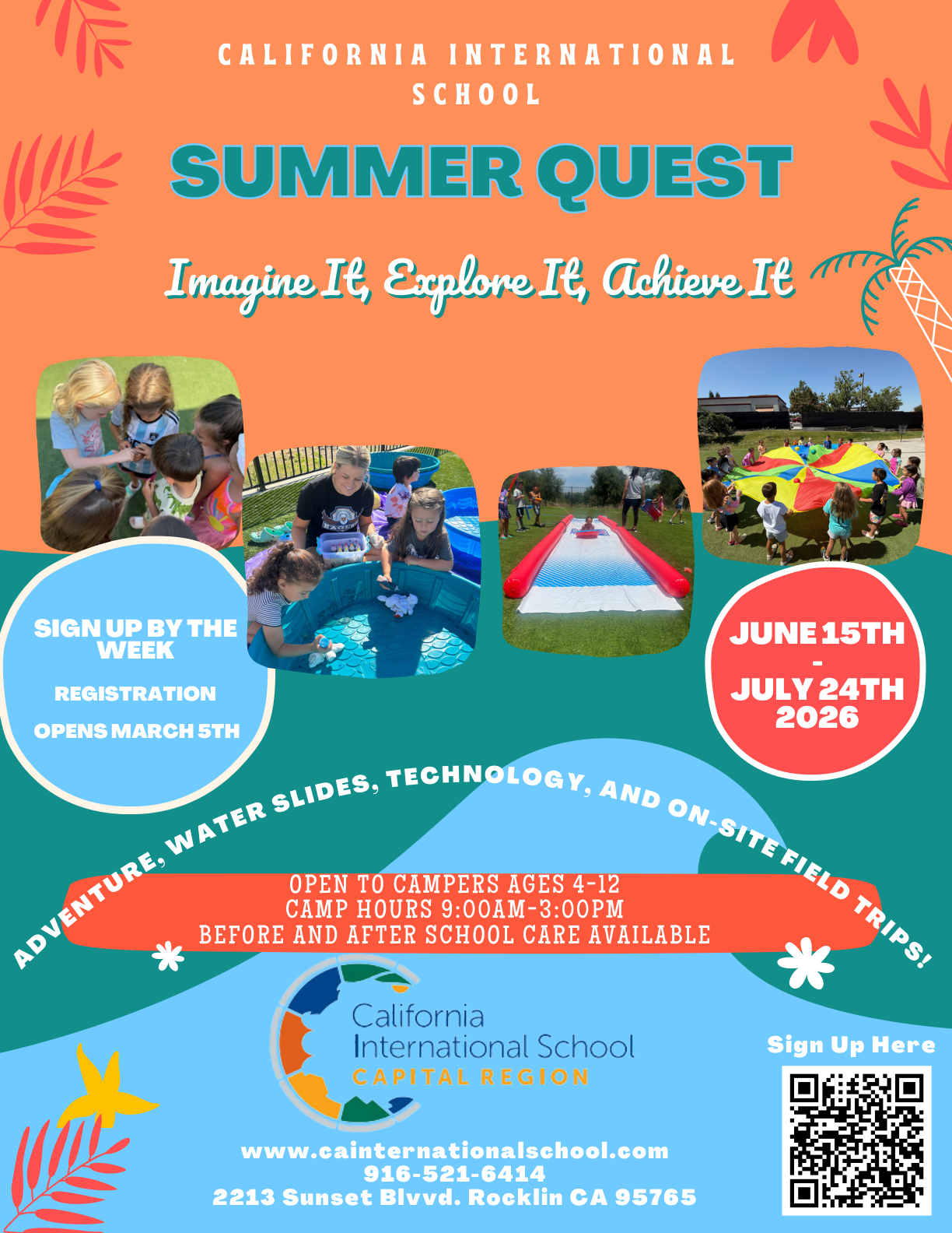 Back to All Events Summer Camp Monday, June 15, 2026 5:30 PM Friday, July 24, 2026 6:30 PM California International School 2213 Sunset Blvd Rocklin, CA 95765 United States (map) Google Calendar ICS SUMMER CAMP REGISTRATION